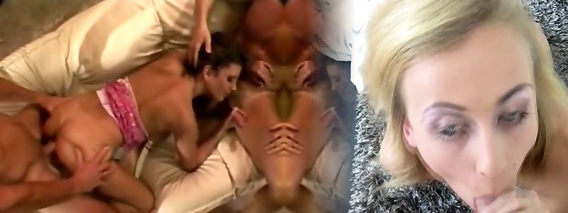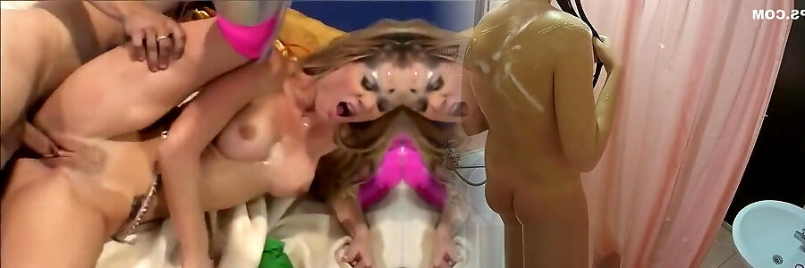 Three studs give the crazy ash-blonde cougar a raunchy dual penetration during their perspiring assfuck four-way