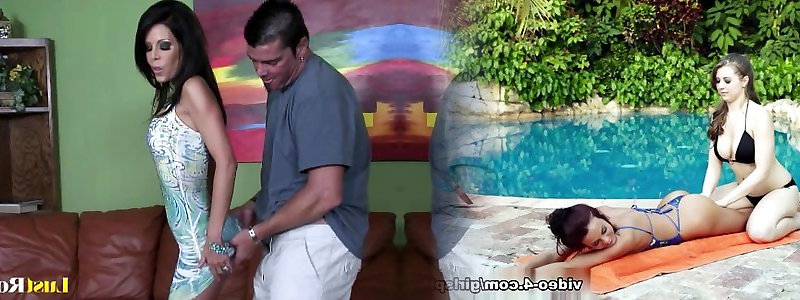 Tall slender dark-haired stunner butt-fucked by petite podgy guy