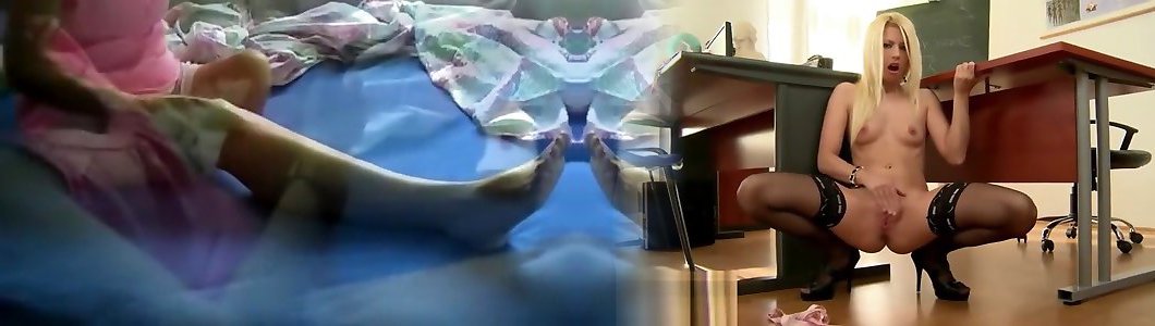 Rainbow stockings Cindy Carson plays with her beaver and dual pentrated