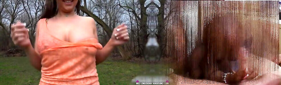Young brunette Nikki Sims flashing natural boobies outdoors