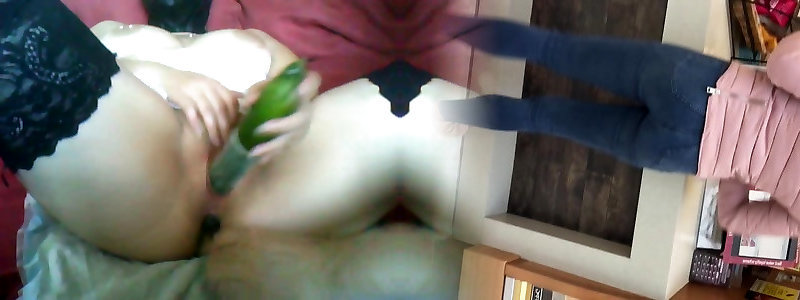Plunging her cookie with a fucky-fucky implement during the time that her gazoo eats up his ding-cumbot