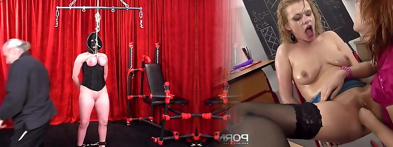 2 obscene female with stripped to the waist harness are abjected by senior fellow