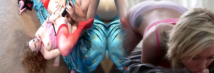 Hot and voracious lezzies in corsets bang each others a-holes with a fake penis