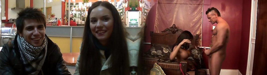 Handsome bar stunners deep-throat beefsticks in public
