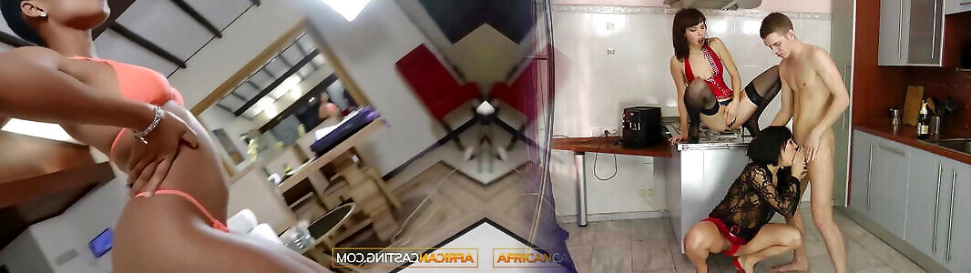 Very beautiful black models are throating white cock on the red sofa