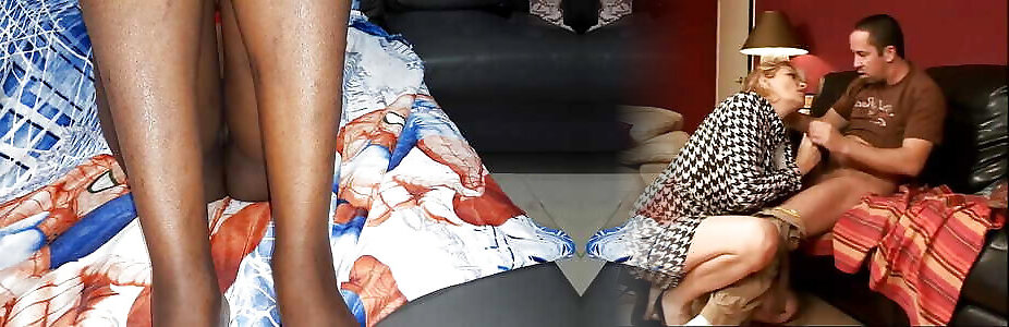mamie poilue en collants noirs ouvre les jambes pour lui
