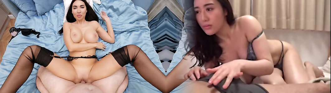 seducente bruna utilizza le sue mani per fare stepdad cum-pov